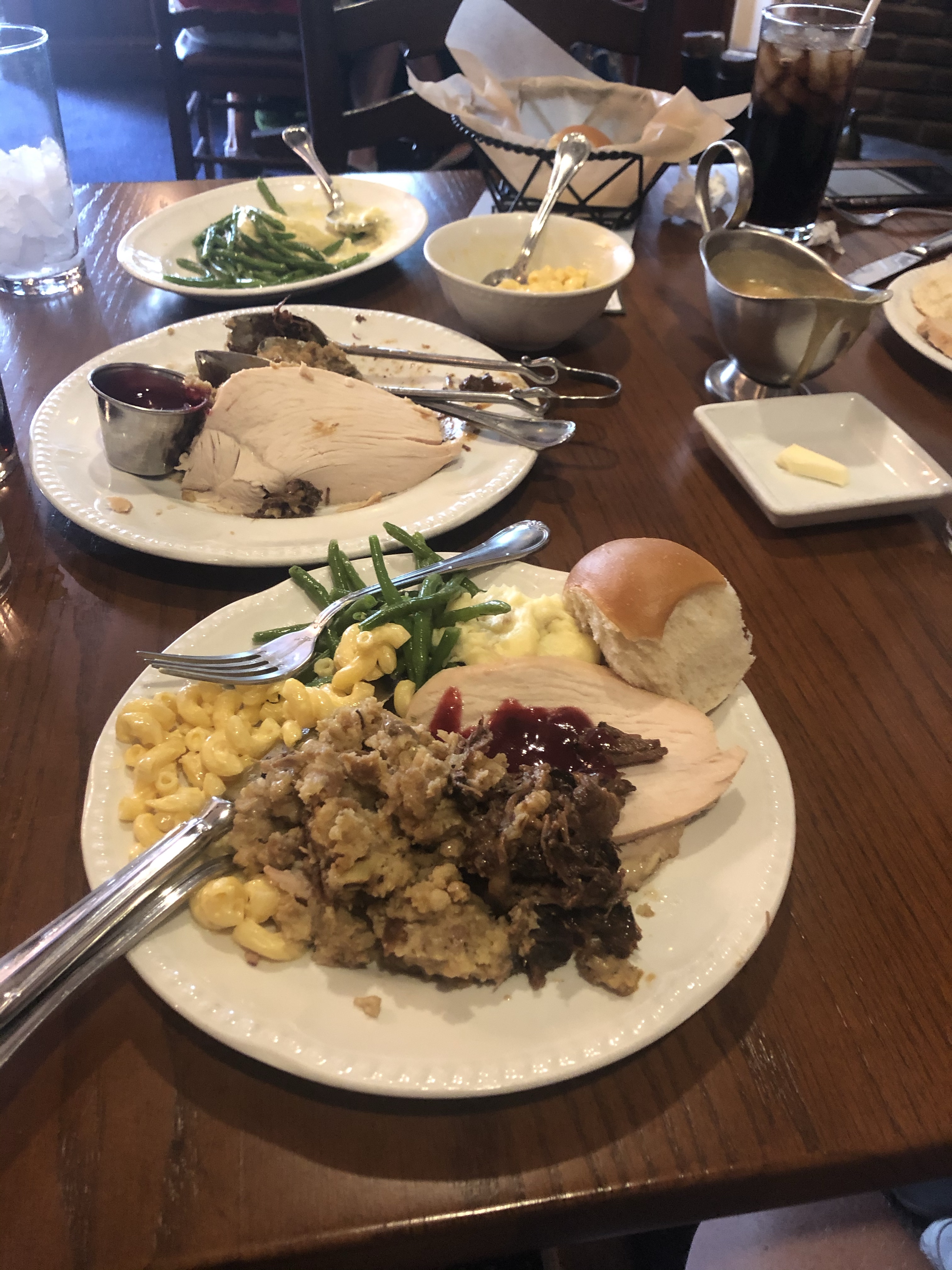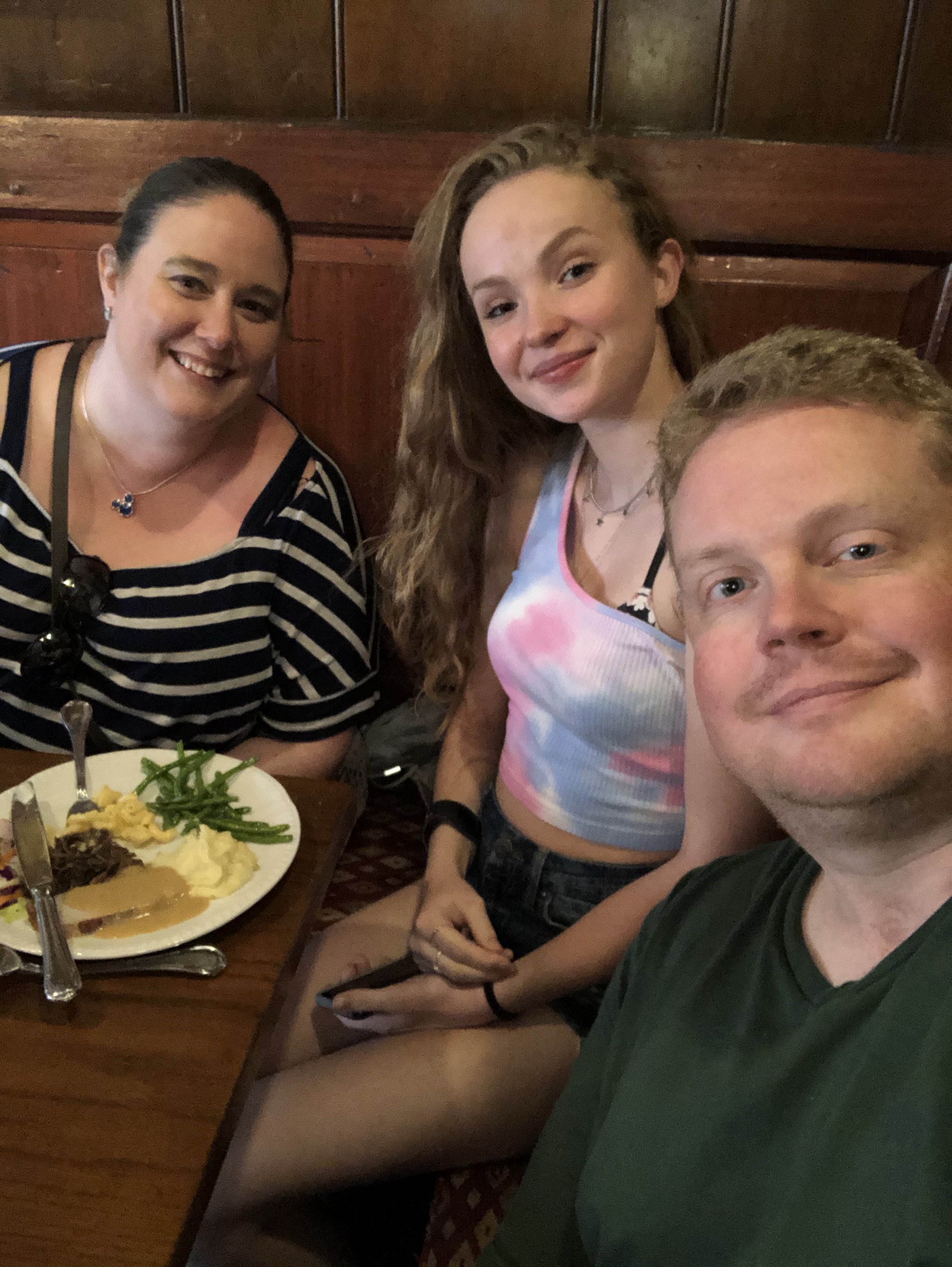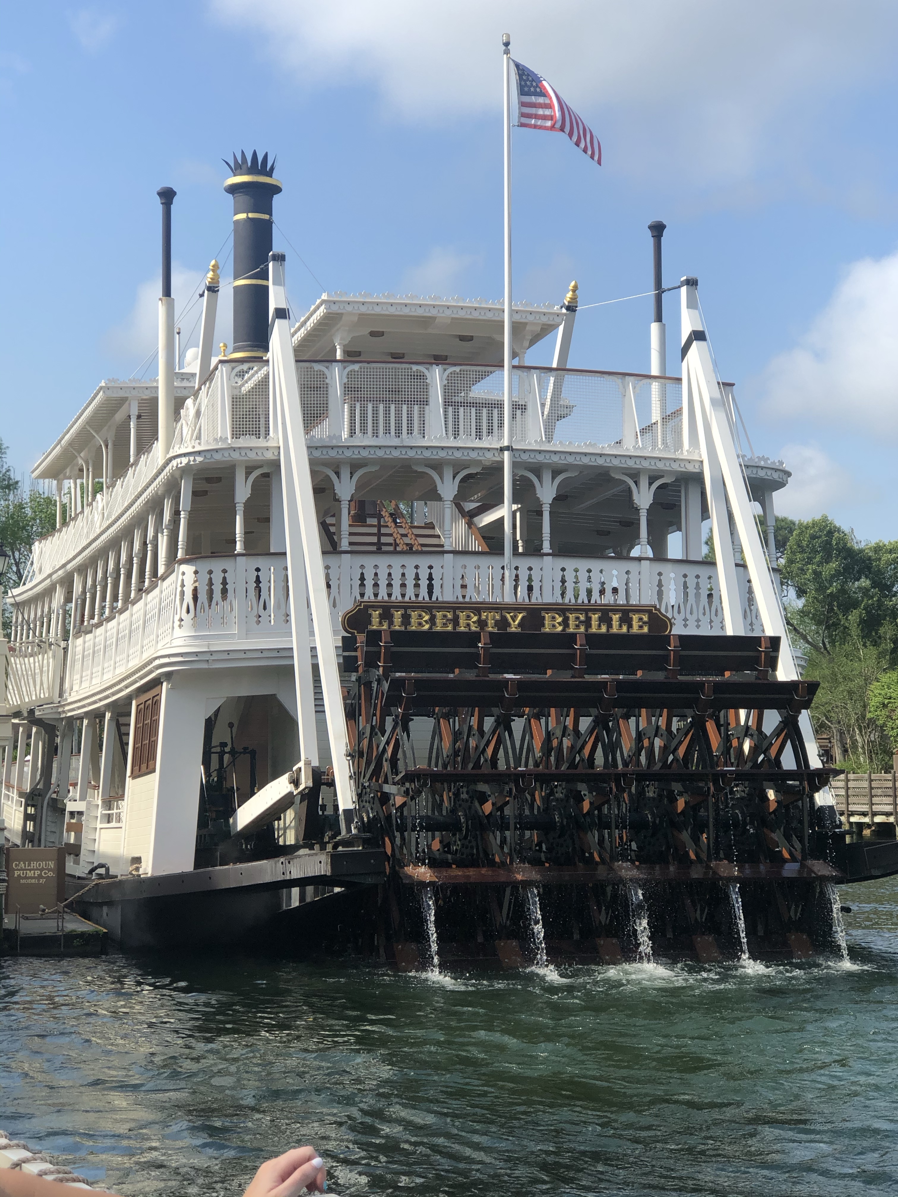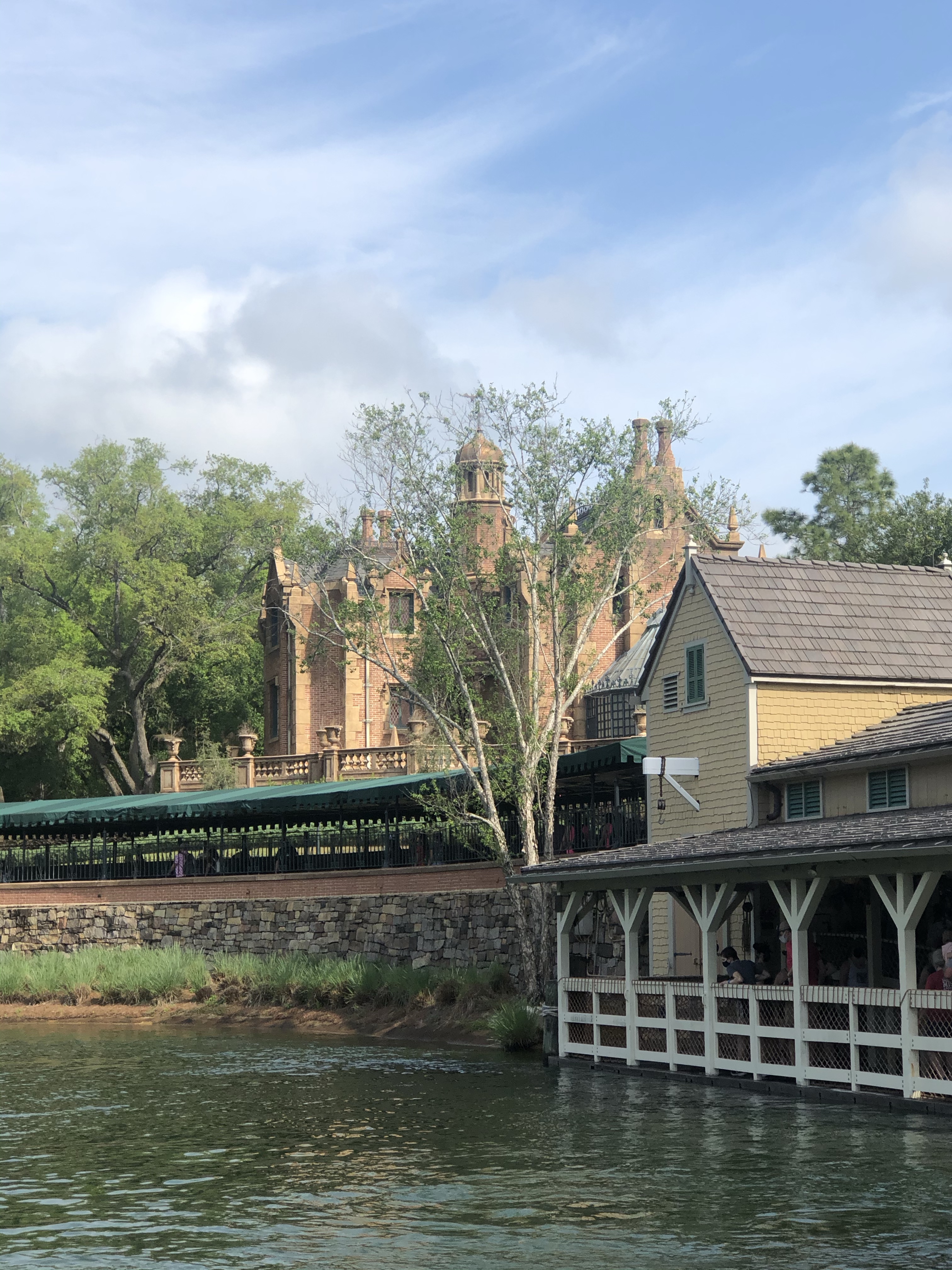 We had lunch in Liberty Square at the Liberty Tree tavern. It’s all you can eat, family-style food. We had salad and rolls, roast Turkey, roast pork, pot roast, herb dressing, mashed potatoes, green beans, and Mac and cheese, then okey gooey toffee cake for dessert. So good. And it was nice to sit down and get out of the heat for a bit. Also, it was nice to get out of the masks for a bit.